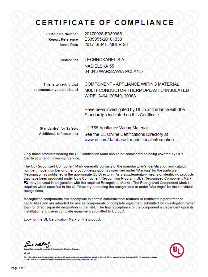 We are pleased to announce that Technokabel S.A. has obtained another international certification issued by Underwriters Laboratories (UL), USA.